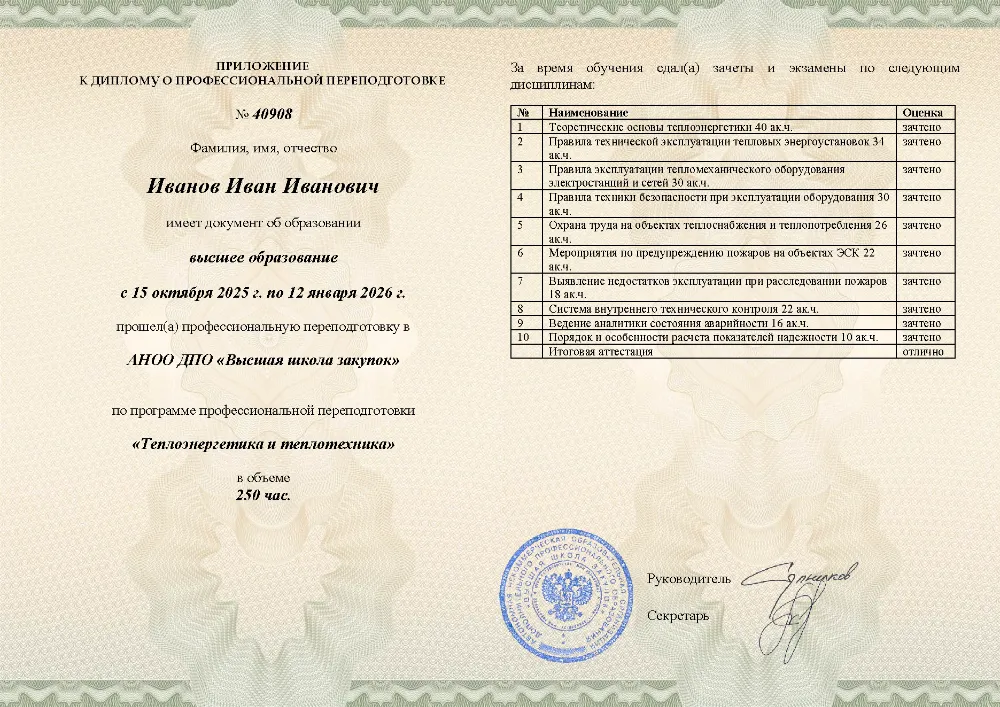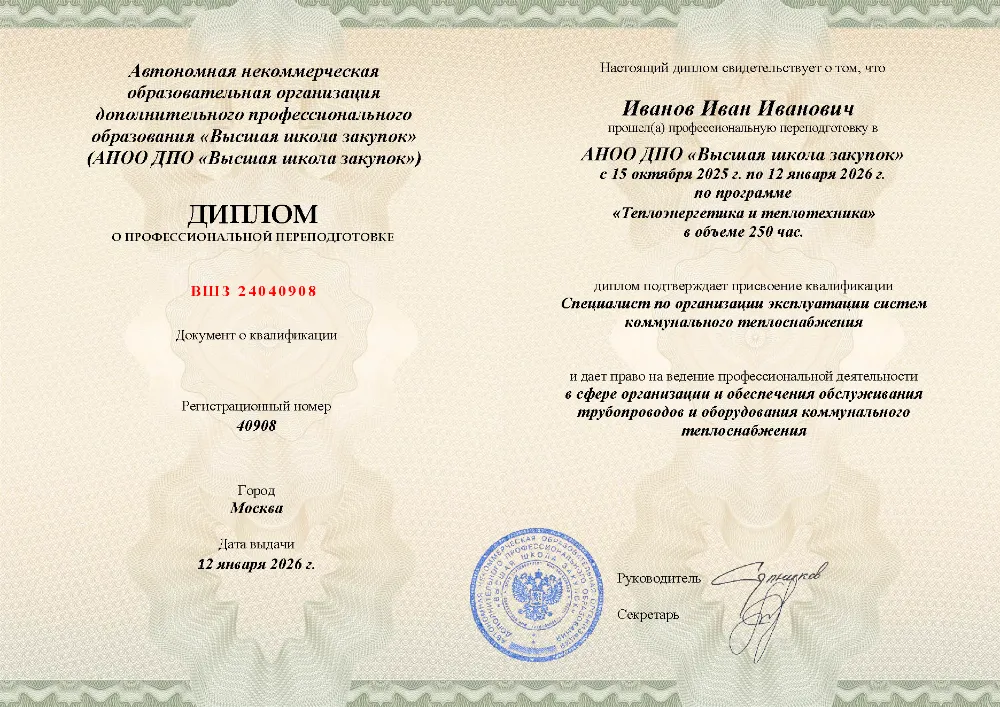 Специализированная программа профессиональной переподготовки, содержащая 250 академических часов обучения, предназначена для инженеров-теплоэнергетиков, сотрудников котельных и лиц, ответственных за безопасность тепловых сетей. Заниматься можно полностью удаленно в Анадыре, совмещая учебу с профессиональной деятельностью. Курс включает теоретическую базу теплотехники, правила технической эксплуатации энергоустановок, а также нормы охраны труда и пожарной безопасности. Слушатели освоят современные методы анализа надежности объектов теплоснабжения. Итоговая аттестация проходит в формате несложного теста (до 10 вопросов) без ограничений по времени и количеству заходов (99% успешных сдач с первой попытки). Рефераты и защиты исключены. Согласно анализу цен, это самый дешевый курс среди аналогичных программ. Диплом выдается за 1 день, а запись в ФРДО появляется в день выдачи документа.