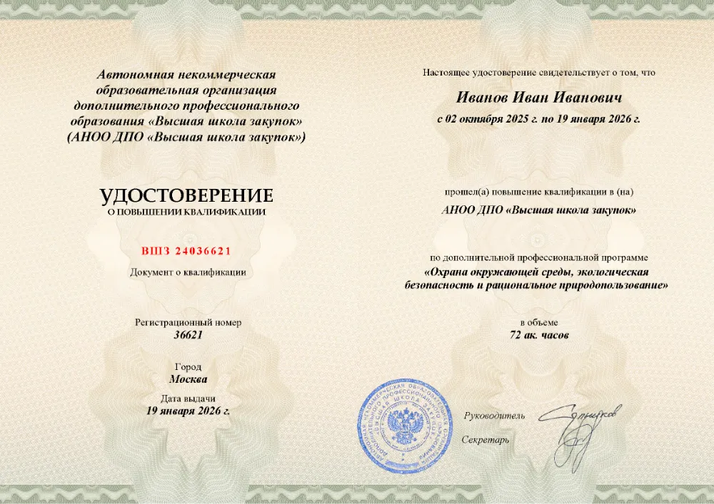 Программа повышения квалификации объемом 72 академических часа разработана для экологов предприятий, руководителей и ответственных за экологическую политику в организациях. Обучение проходит дистанционно в Анадыре. Учебный план охватывает государственное регулирование в области экологии, процедуру лицензирования природоохранных мероприятий, организацию надзора и принципы рационального использования ресурсов. Также рассматриваются меры юридической ответственности за несоблюдение экологических норм. Аттестация максимально упрощена: онлайн-тестирование до 10 вопросов без лимита времени и попыток (99% сдают с первого раза). Рефераты и защиты исключены. Согласно анализу рынка, это самый бюджетный вариант обучения в своем классе. Удостоверение оформляется за 1 день, а данные в реестр ФРДО заносятся непосредственно в день выдачи.