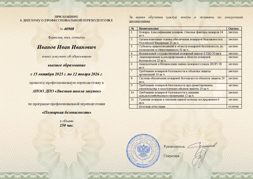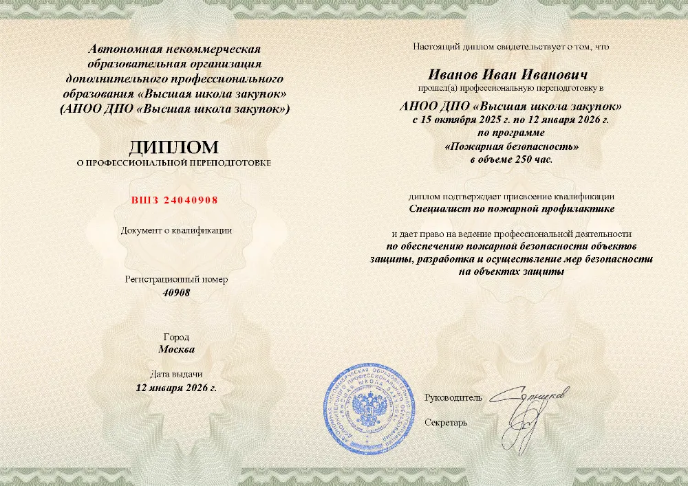 Профессиональная переподготовка, 250 академических часов, 11 модулей: организационные основы и законодательство в области пожарной безопасности, лицензирование и надзор, требования к объектам защиты, проектирование, тушение пожаров и оказание первой помощи пострадавшим. Онлайн-обучение в в Анадыре с итоговой аттестацией.