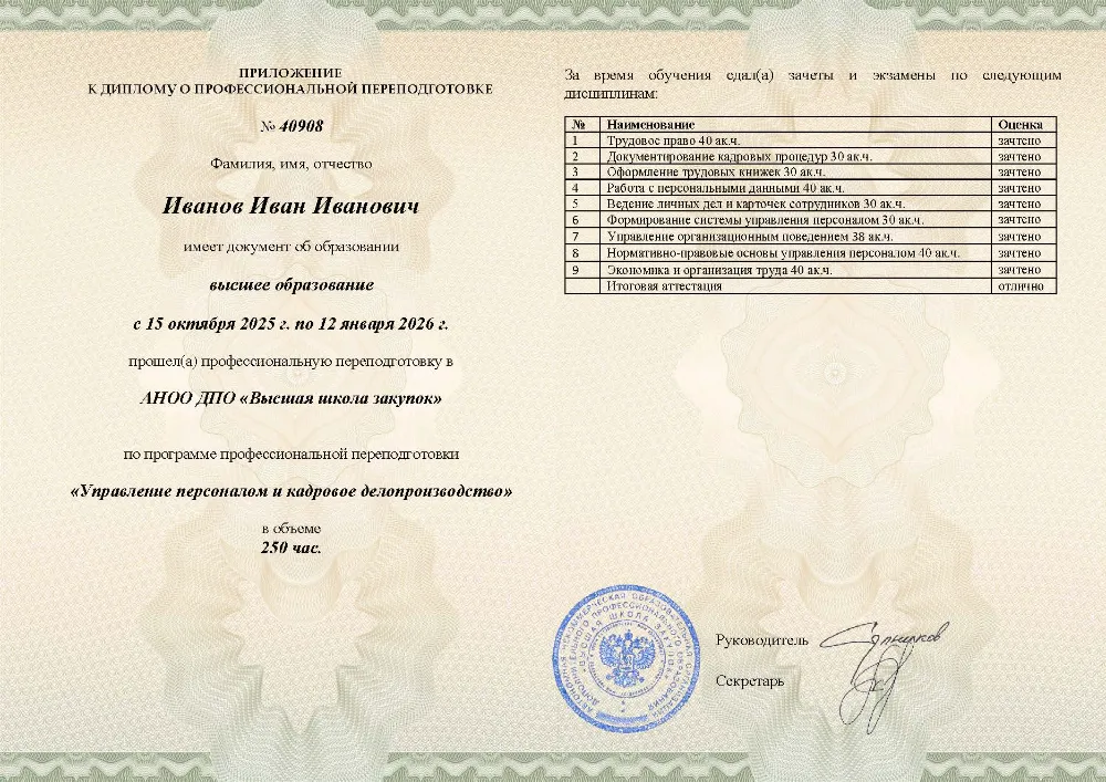 Программа профессиональной переподготовки (250 академических часов) охватывает полный цикл кадрового делопроизводства: основы административного права, документирование трудовых отношений, ведение трудовых книжек, работа с персональными данными и личными делами сотрудников. Дистанционный формат доступен в Анадыре и другим регионам. Итоговая аттестация — лёгкий тест до 10 вопросов без ограничения времени и числа попыток (99% сдают с первого раза). Рефератов и дипломных работ нет. Диплом выдаётся за 1 день, данные вносятся в ФРДО в день выдачи. По результатам мониторинга рынка — это самый дешёвый курс среди аналогов.