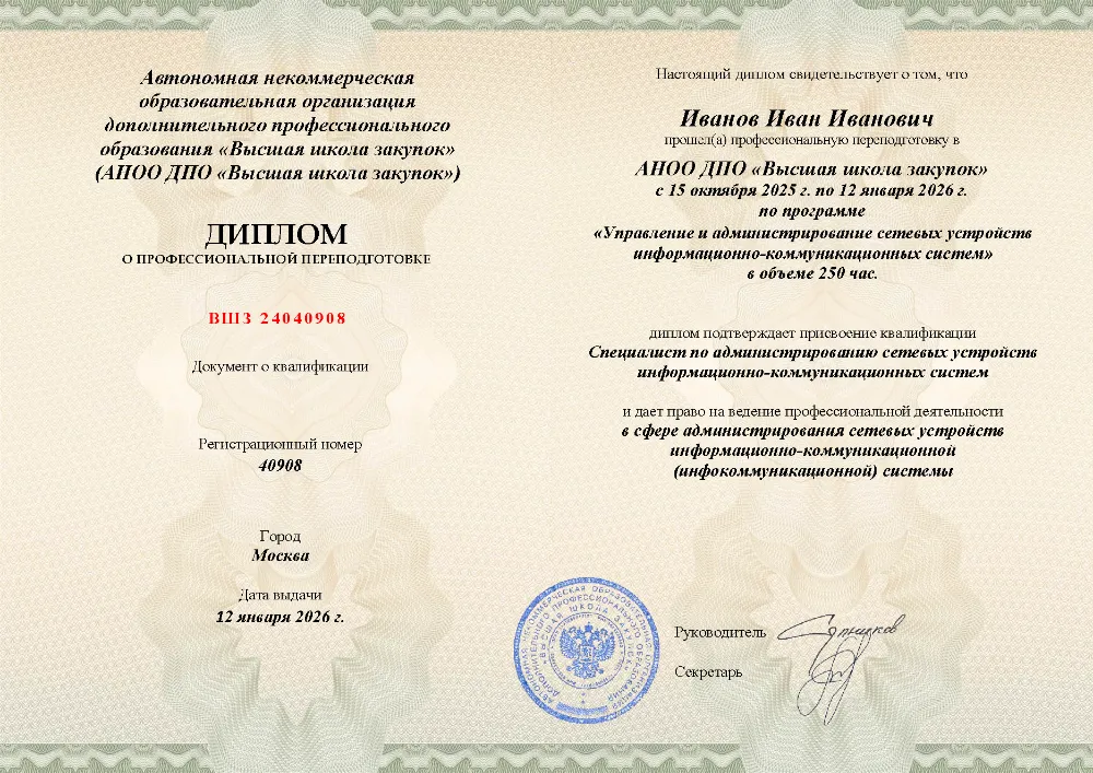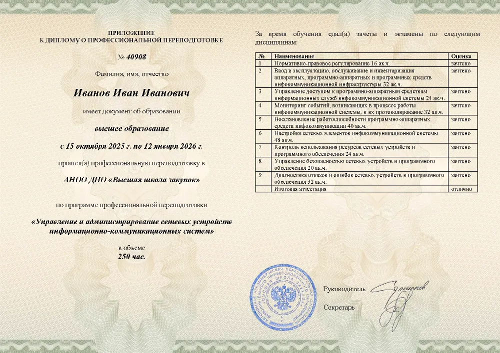 Профессиональная переподготовка, 250 академических часов, 9 модулей: нормативно-правовое регулирование и ввод в эксплуатацию, настройка и мониторинг сетевых устройств, управление доступом и безопасностью, диагностика и восстановление работоспособности инфокоммуникационных систем. Онлайн-обучение в в Анадыре с итоговой аттестацией.