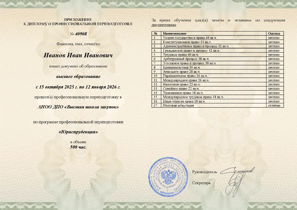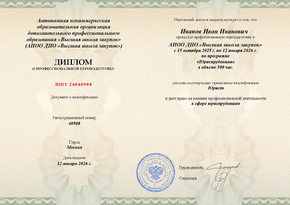 Профессиональная переподготовка на 500 академических часов, включает 16 модулей: теория государства и права, конституционное, гражданское, уголовное и трудовое право, арбитражный и административный процесс, налоговое, земельное, таможенное и международное право. Итоговая аттестация проходит в форме лёгкого тестирования (до 10 вопросов, без ограничения времени, неограниченное число попыток) — без рефератов, дипломных работ и защит. Диплом выдается за 1 день, внесение в ФРДО — в день выдачи. Обучение в Анадыре и по всей России. Проведён мониторинг рынка: это самый дешевый курс на рынке среди аналогичных программ.