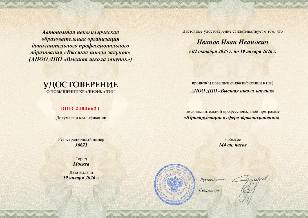 Программа повышения квалификации объёмом 144 академических часа охватывает основы государственного, гражданского и административного права, трудовое и налоговое право, правовые основы охраны здоровья, права граждан и медицинских работников, а также юридическую ответственность в медицине. Обучение проходит онлайн в Анадыре и по всей России. Итоговая аттестация — лёгкое тестирование до 10 вопросов без ограничения времени и с неограниченным числом попыток (99% слушателей сдают с первого раза), без рефератов и защит. Удостоверение выдаётся за 1 день, внесение в ФРДО — в день выдачи.