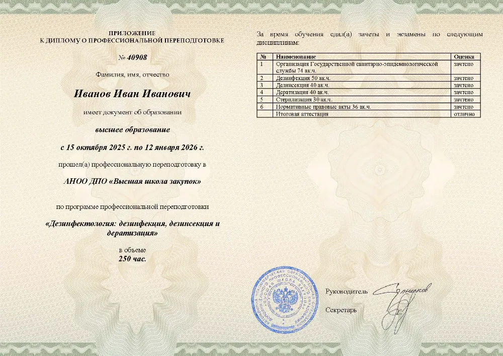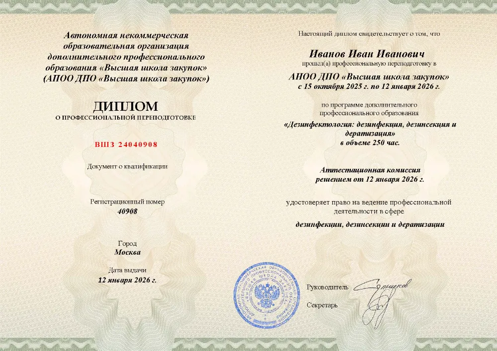 Курс профессиональной переподготовки объемом 250 академических часов разработан для сотрудников санитарно-эпидемиологических служб, дезинфекционных станций и профильных организаций. Обучение проходит дистанционно в Анадыре. Программа включает изучение основ работы санитарных служб, методов стерилизации и всех направлений обеззараживания: дезинфекции, борьбы с насекомыми (дезинсекции) и грызунами (дератизации). Учебный план имеет практическую направленность и охватывает актуальные правовые нормы. Аттестация максимально упрощена: онлайн-тест до 10 вопросов без лимита времени и количества попыток (99% слушателей справляются с первого раза). Никаких рефератов и защит работ. Мониторинг рынка подтверждает, что это наиболее бюджетный вариант обучения в своем сегменте. Диплом оформляется за 1 день, сведения в реестр ФРДО заносятся непосредственно в день выдачи.