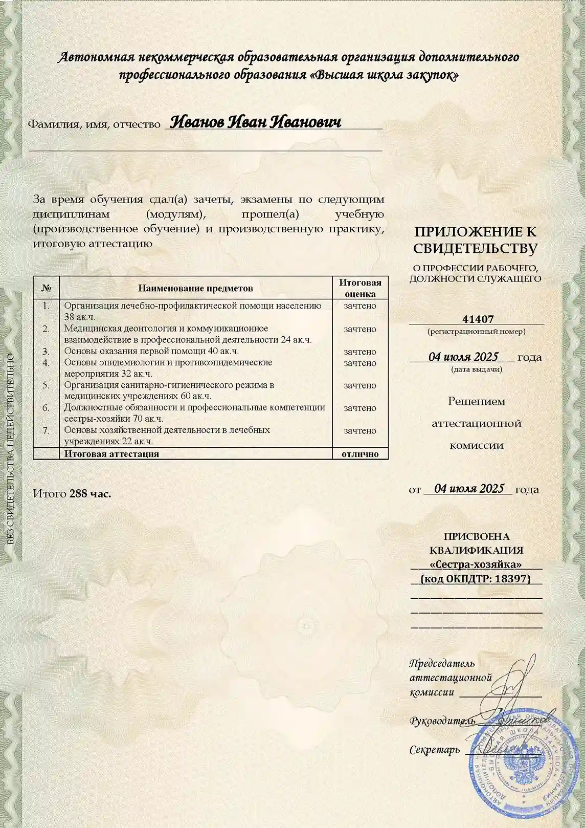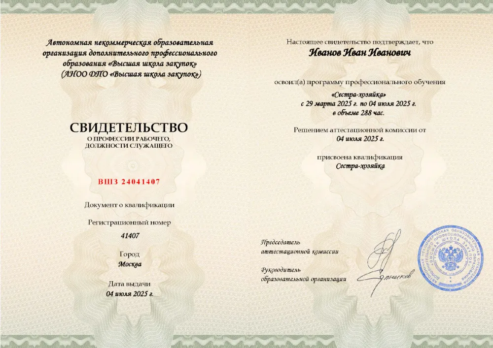 Программа профессионального обучения, содержащая 288 академических часов материала, предназначена для персонала, обеспечивающего санитарное содержание медицинских и социальных объектов. Заниматься можно полностью удаленно в Анадыре, совмещая учебу с работой. Курс охватывает должностные функции санитара, регламенты уборки помещений и обработки оборудования, правила транспортировки пациентов, а также нормы работы с медицинскими отходами и основы первой помощи. Итоговая аттестация проходит в формате несложного теста (до 10 вопросов) без ограничений по времени и количеству попыток (99% успешных сдач с первого раза). Рефераты и защиты исключены. Согласно анализу цен, это самый дешевый курс среди аналогичных программ. Диплом выдается за 1 день, а запись в ФРДО появляется в день выдачи документа.