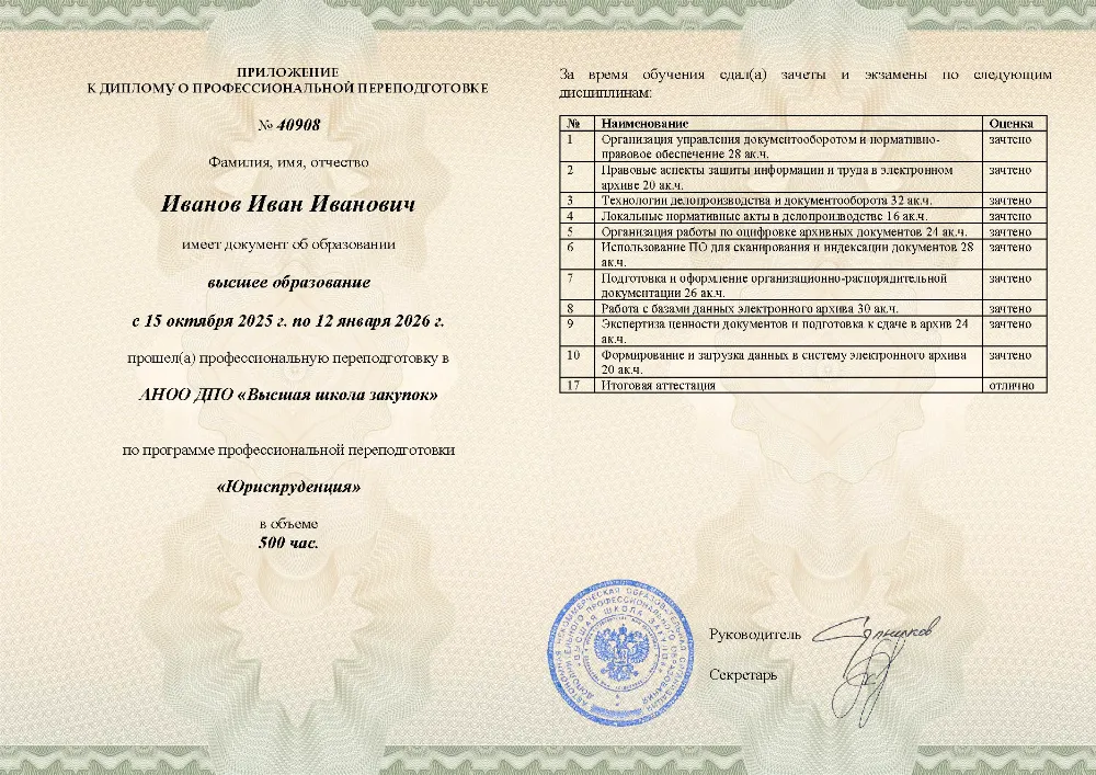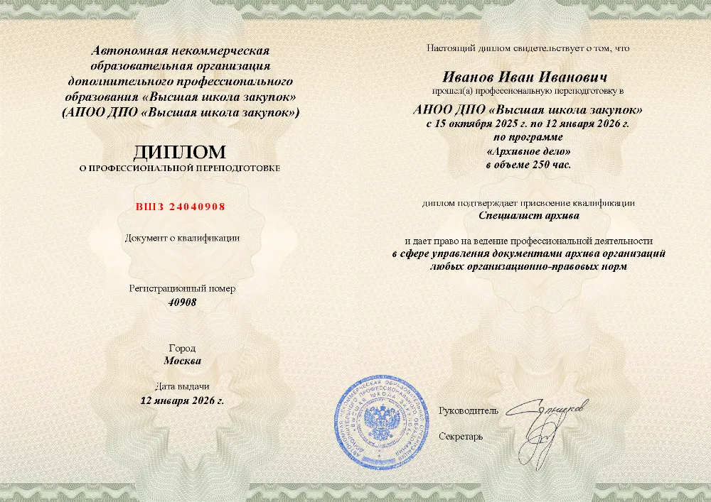 Курс профессиональной переподготовки на 500 часов даёт комплексные знания от нормативной базы до современных технологий работы с документами. В программе: экспертиза ценности документов, обеспечение сохранности архивных фондов, создание поисковых систем, а также практика работы с документацией по личному составу. Занятия проходят в дистанционном формате, доступны для слушателей в Анадыре и в любом городе России. Мы провели мониторинг рынка и подтверждаем: это самый дешевый курс среди аналогичных предложений. Для завершения обучения предусмотрена итоговая аттестация — лёгкое тестирование не более чем из 10 вопросов. Время не ограничено, количество попыток — любое. 99% слушателей успешно проходят тест с первой попытки. Писать рефераты, дипломные работы или проходить защиту не нужно. Диплом о профессиональной переподготовке выдаётся за 1 день, а сведения о нём вносятся в ФРДО в день выдачи — это гарантирует оперативную проверку работодателем.