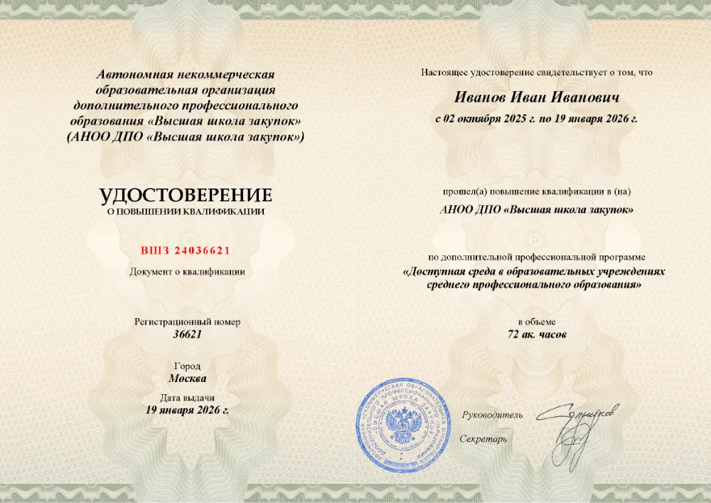 Курс повышения квалификации объемом 72 академических часа разработан для педагогов, руководителей и специалистов СПО, ответственных за инклюзивное обучение. Программа реализуется в дистанционном формате в Анадыре. Учебный план включает изучение законодательной базы инклюзии, регламенты паспортизации инфраструктуры колледжей и техникумов, а также методики взаимодействия с обучающимися, имеющими ОВЗ. Дополнительно рассматриваются вопросы педагогического контроля и эффективного тайм-менеджмента для преподавателей. Аттестация максимально упрощена: онлайн-тест до 10 вопросов без лимита времени и количества заходов (99% успешных сдач с первой попытки). Никаких рефератов и защит работ. Актуальный мониторинг подтверждает, что это наиболее бюджетный вариант обучения в своей нише. Удостоверение оформляется за 1 день, а сведения в реестр ФРДО заносятся непосредственно в день выдачи.