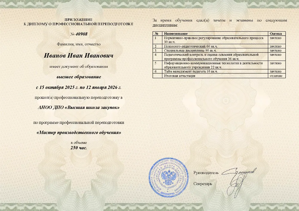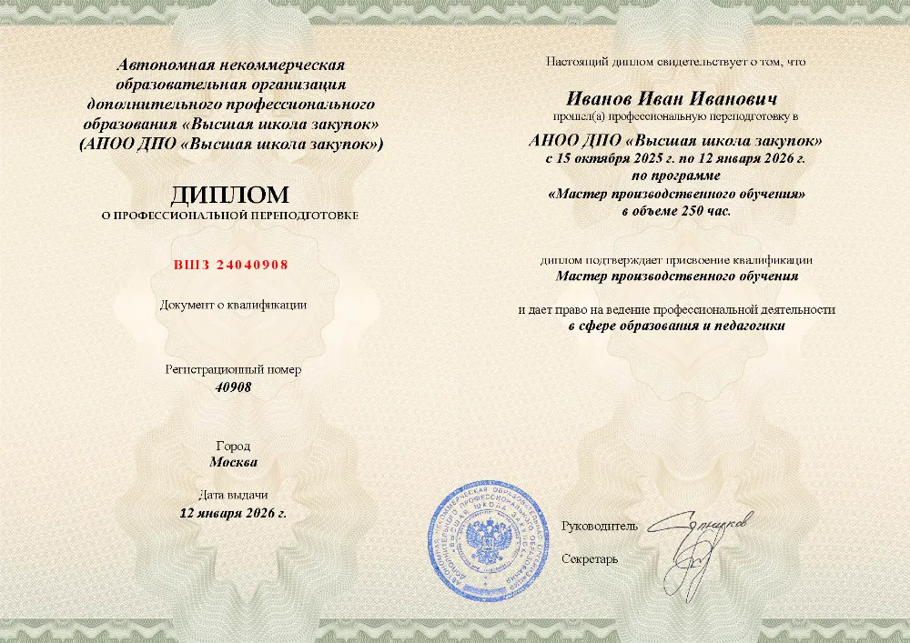 Курс профессиональной переподготовки объемом 250 академических часов разработан для специалистов, занимающихся подготовкой кадров в системе СПО, учебных центрах и на производстве. Обучение организовано в дистанционном формате в Анадыре. Программа включает изучение нормативно-правовой базы образования, основ психологии и педагогики, методики профобучения и проектирования учебных планов. Также рассматриваются вопросы цифровизации учебного процесса (ИКТ), системы контроля знаний и личной эффективности преподавателя. Аттестация максимально упрощена: онлайн-тест до 10 вопросов без лимита времени и количества попыток (99% слушателей справляются с первого раза). Никаких рефератов и защит работ. Актуальный мониторинг подтверждает, что это наиболее бюджетный вариант обучения в своей нише. Диплом оформляется за 1 день, а сведения в реестр ФРДО заносятся непосредственно в день выдачи.