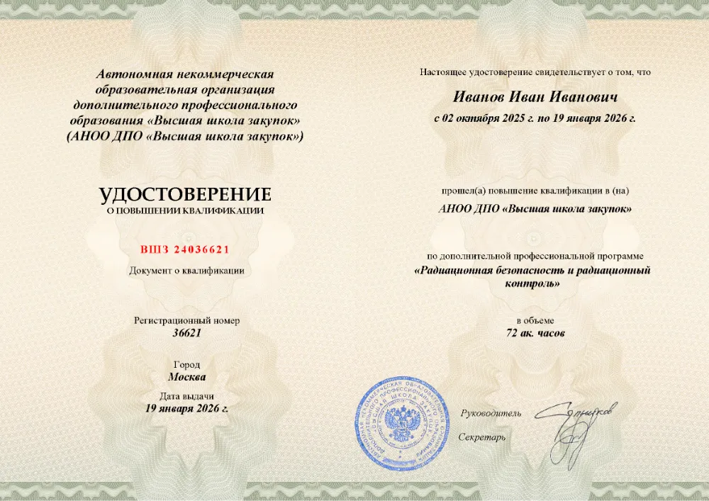 Специализированная программа повышения квалификации, включающая 72 академических часа материала, предназначена для лиц, ответственных за радиационную безопасность в медицине, науке и на производстве. Заниматься можно полностью удаленно в Анадыре, совмещая учебу с работой. Курс охватывает юридические основы работы с ИИИ, методы дозиметрического контроля, правила учета радиоактивных веществ и организацию защиты персонала. Особое внимание уделено ведению документации и обеспечению физической безопасности объектов. Аттестация проходит в формате несложного тестирования (до 10 вопросов) без ограничений по времени и количеству попыток (99% успешных сдач с первого раза). Рефераты и защиты исключены. Согласно анализу цен, это самый дешевый курс среди аналогичных программ. Удостоверение выдается за 1 день, а запись в ФРДО появляется в день выдачи документа.