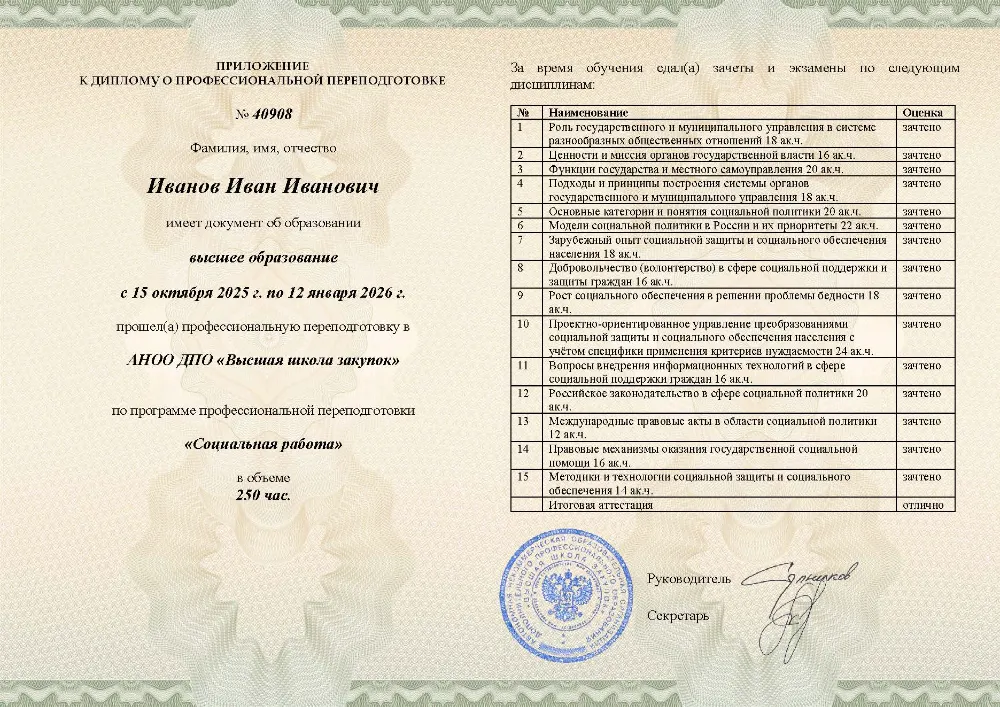 Программа профессионального обучения (250 академических часов) охватывает ключевые аспекты социальной политики, правовые механизмы оказания помощи, технологии социальной защиты, работу с волонтёрами и проектное управление в социальной сфере. Обучение проходит дистанционно, доступно жителям всех регионов России, включая в Анадыре. Итоговая аттестация — лёгкое тестирование до 10 вопросов без ограничения времени и с неограниченным числом попыток (99% слушателей сдают с первого раза); рефераты и дипломные работы не требуются. Свидетельство установленного образца выдаётся за 1 день, сведения о нём вносятся в ФРДО в день выдачи документа. Мониторинг рынка подтверждает: это самый дешёвый курс среди аналогичных программ профессионального обучения.