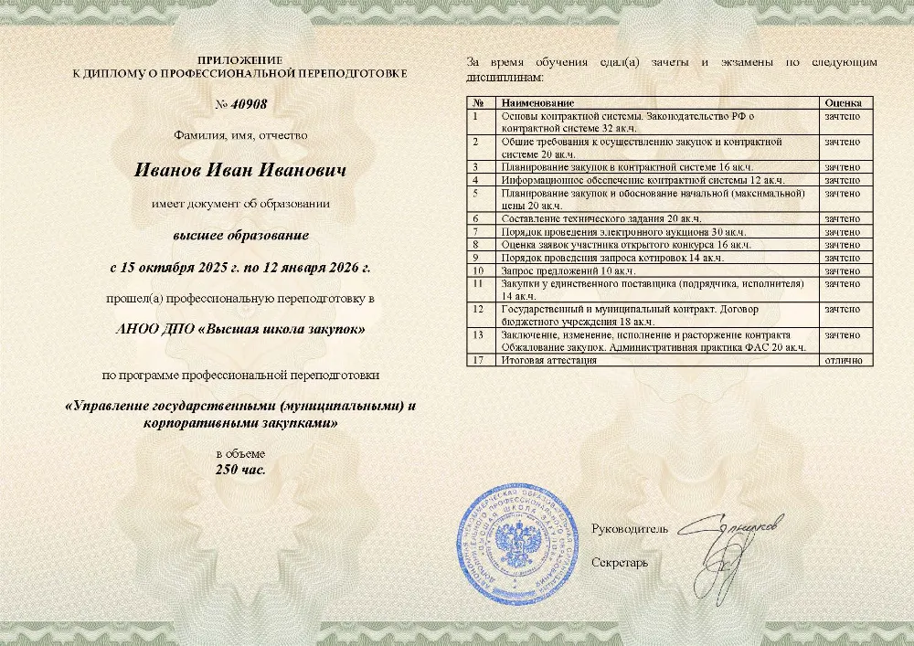 Курс профессиональной переподготовки объемом 500 академических часов разработан для руководителей и сотрудников контрактных служб, работающих в бюджетном секторе. Обучение организовано дистанционно в Анадыре. Программа детально рассматривает правовой регламент контрактной системы, этапы планирования и обоснования нужд, проведение конкурентных процедур, а также сопровождение контрактов и приемку результатов. По завершении обучения присваивается квалификация «Эксперт». Аттестация проходит в формате упрощенного тестирования до 10 вопросов; отсутствие лимитов по времени и числу заходов позволяет 99% слушателей успешно сдать экзамен с первого раза. Рефераты и защиты исключены. Согласно результатам мониторинга, это самое выгодное ценовое предложение среди аналогов. Диплом выдается за 1 день, а сведения в ФРДО вносятся непосредственно в день выдачи.
